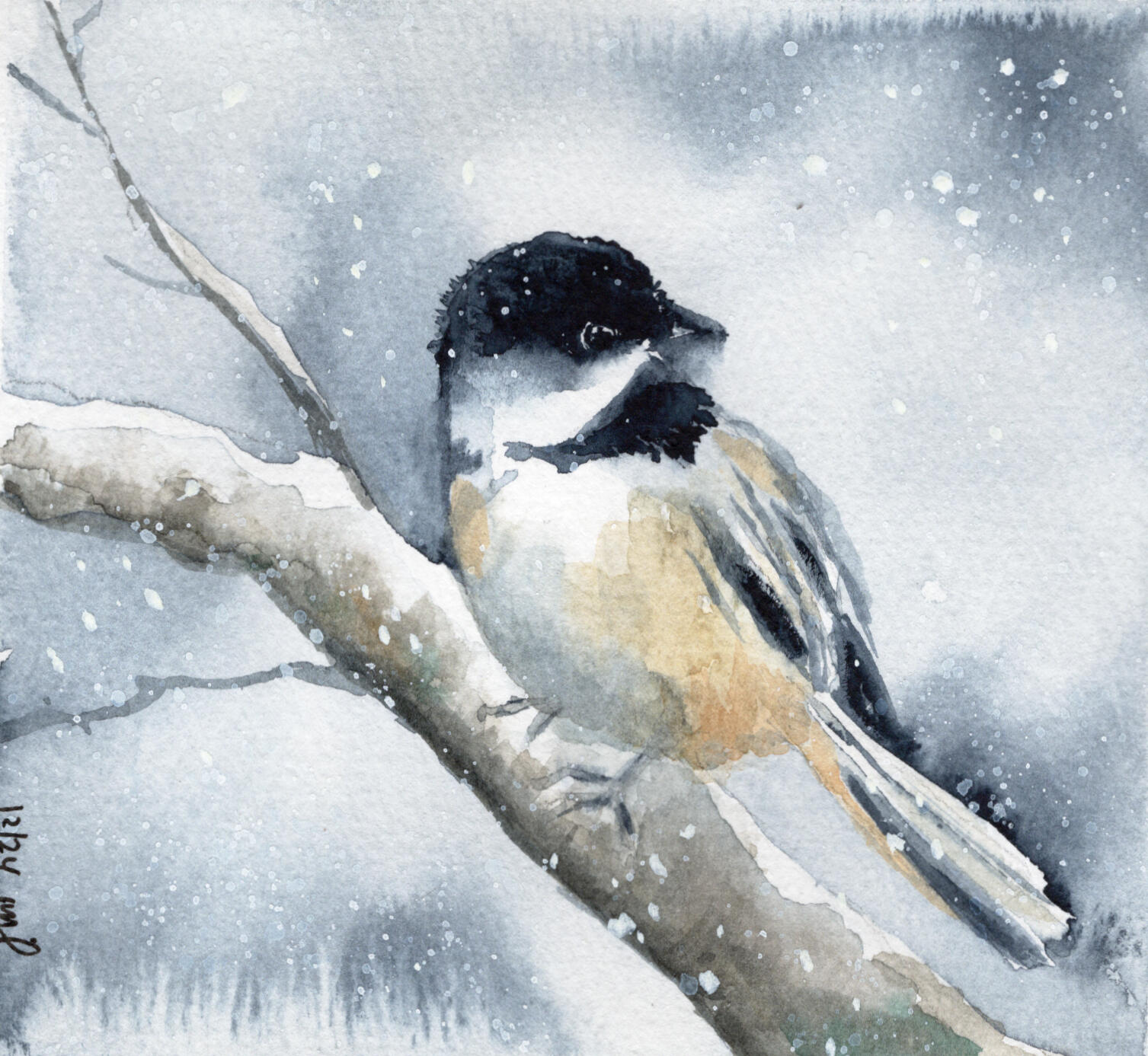 Watercolor 4 x 5 "1st Winter Chickadee" Private Collection