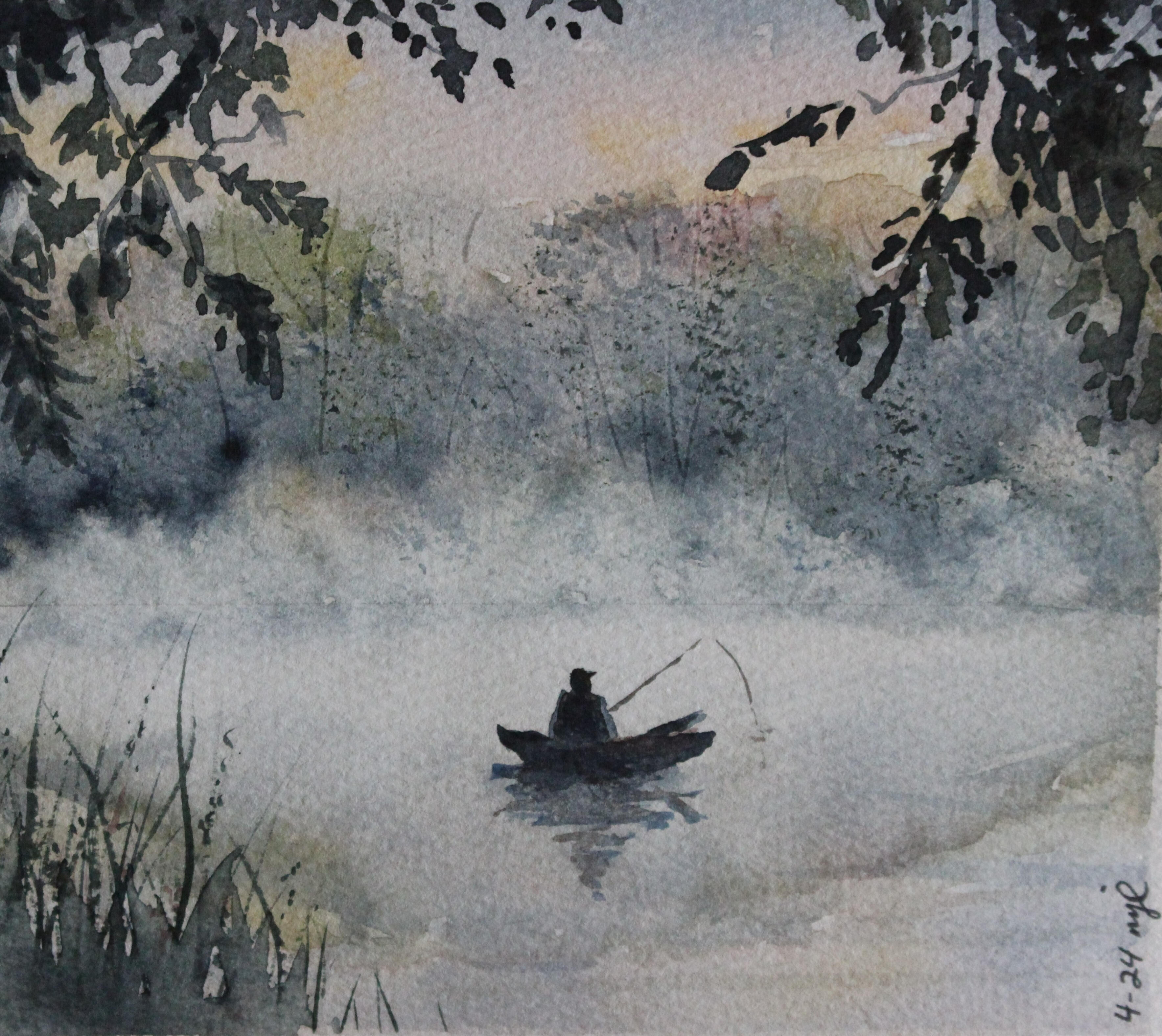 Watercolor 4.5 x 5.25 "Misty Lake Morning" Private Collection